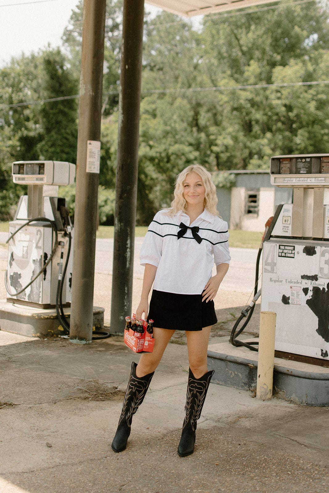Looking for a versatile blouse that can elevate any outfit? Look no further than our White Bow Detail Poplin Blouse! With its short puff sleeves. flowy fit. and classic collar. this blouse adds a touch of femininity to any look. The black bow detail adds a chic touch to this poplin blouse. making it a must-have in your wardrobe!
